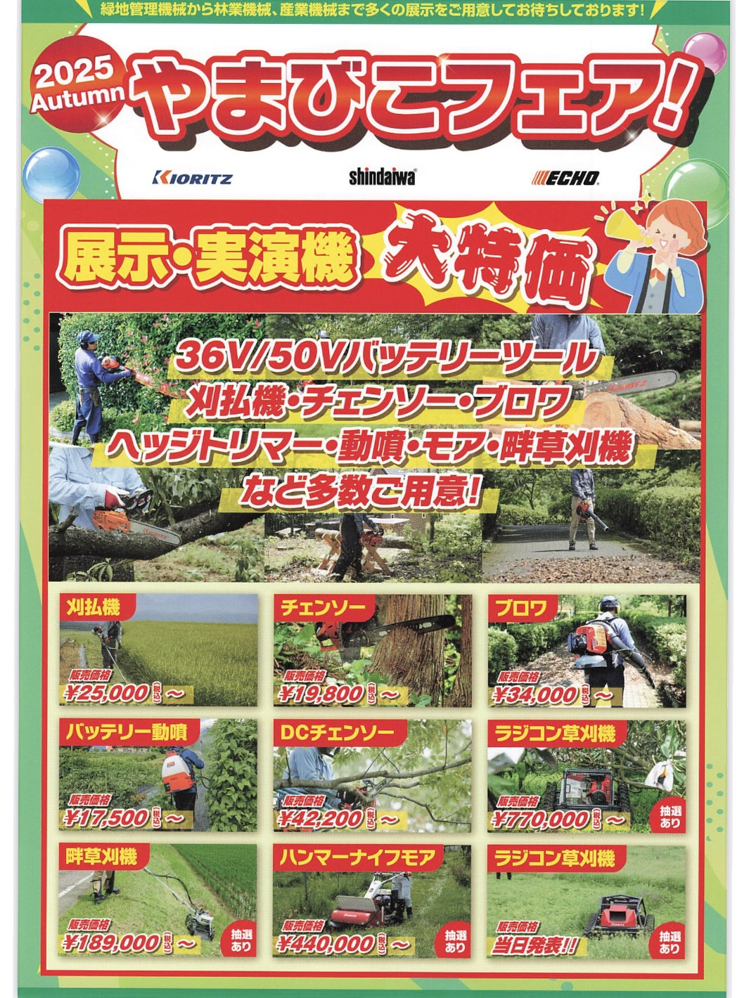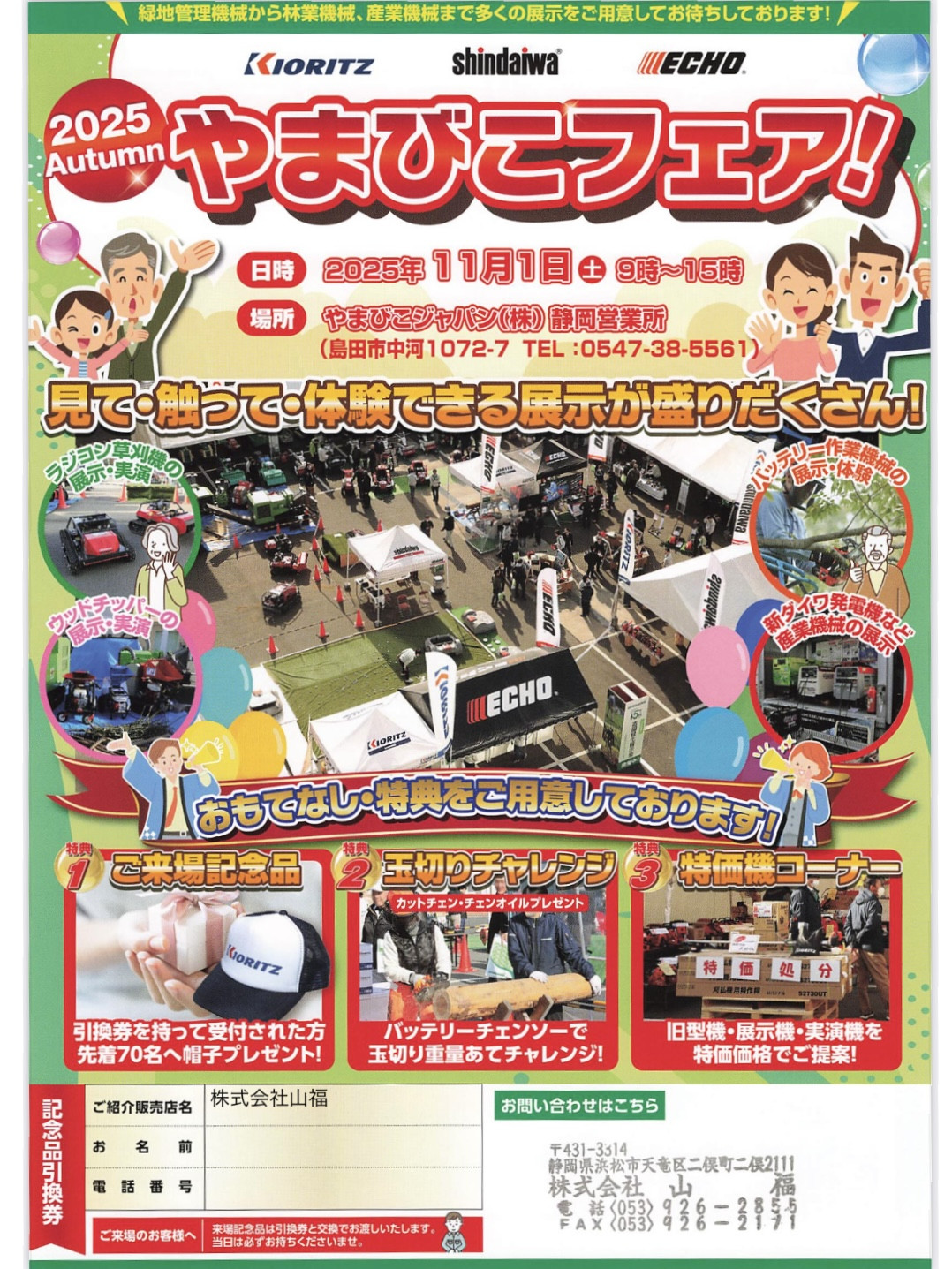 やまびこジャパン(株)静岡営業所主催「やまびこ製品展示・実演機大特価即売会」が2025年11月1日(土)に静岡県島田市中河1072-7(やまびこジャパン静岡営業所)にて開催されます👏